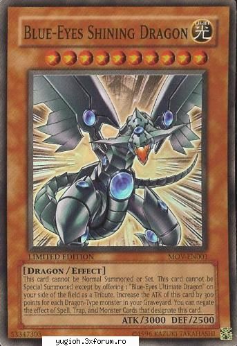 Apai bai fratilor io am numa carti originale sinu joc cu delea falsificate si numi plac monstrii astia super tari ca exodia chaos envoy of the end chaos envoy ofthe begining si destea pt ca stiu ca lepot bate cu usurinta De fapt cu cele mai banale strategii si carti: -Change of Heart sau Brain control si dupaia ii sacrifici -Trap Hole -Tribute to the doomed -Lightning Vortex -Sakuretsu Armor etc. Is mai multe chestii aaa si amuitat mie im place mai mult efectu lu Armed Dragon Lv 5 sau 8 Totusi cele mai valoroase carti ale mele is: -Cybernetic Magician -Armed Dragon Lv 5 -Red Eyes Black Dragon SI: -DARKBLAZE DRAGON -MAJESTICH MECH-GORYU